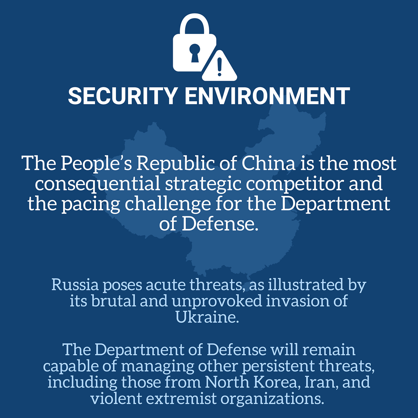 “President Biden has stated that we are living in a “decisive decade,” one stamped by dramatic changes in geopolitics, technology, economics, and our environment… The 2022 National Defense Strategy details the Department’s path forward into that decisive decade—from helping to protect the American people, to promoting global security, to seizing new strategic opportunities, and to realizing and defending our democratic values.”