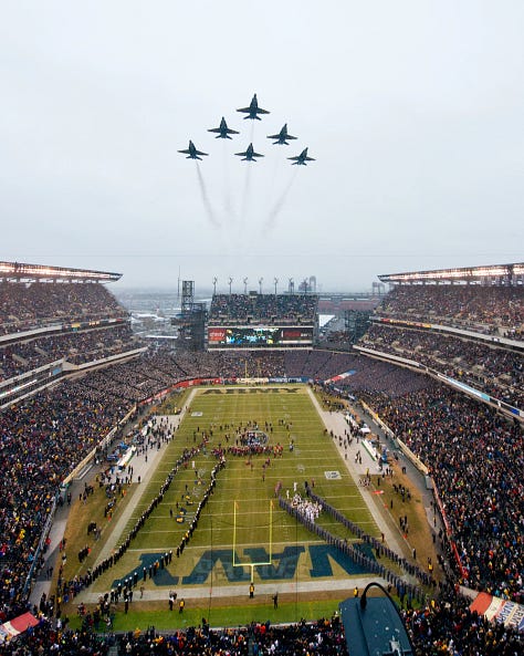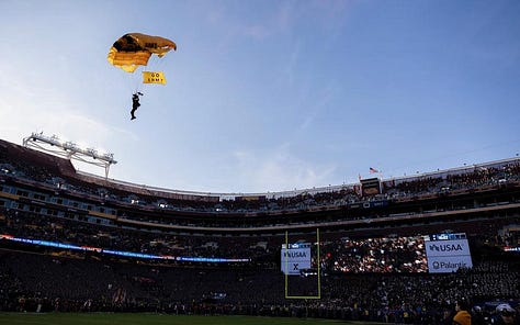 Army helicopters, Navy fighter jets, and parachute teams from the Black Knights and the Navy Leap Frogs regularly open the game with aerial demonstrations.