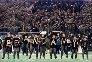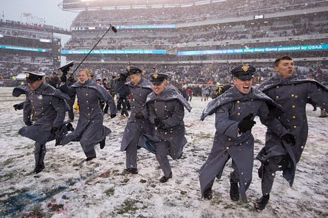 For the fall semester, these cadets and mids live behind “enemy lines,” taking classes, enduring the other academy’s quirks, and blending into a rival culture. Before rejoining their home side, they reveal taped messages on their backs; usually, lighthearted digs at their hosts. A personal favorite: in 1996, the cadets stood out of order and accidentally spelled “BEAN TAVY.” As a USNA grad, I must report this faithfully.