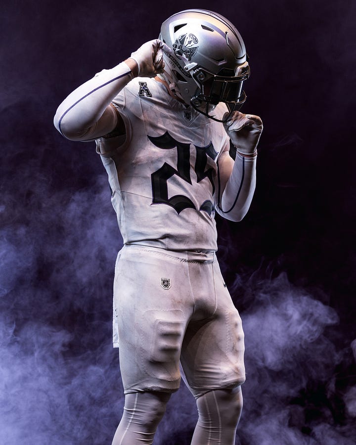 Army’s uniform looks back to 1775 and the founding of the U.S. Army, connecting its earliest roots to the legacy of service that followed. The uniform’s marble primary color on both the jersey and pants represents the lasting strength the American people have provided the Army since its beginning. A distinctive purple streak across the numbers and along the helmet honors the Badge of Military Merit, the Revolutionary War precursor to today’s Purple Heart first authorized by General George Washington. The purple also recognizes the sacrifice of Soldiers and Gold Star Families, tying the design to generations of courage and sacrifice.4