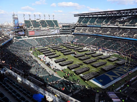 What you hear is cadence: drums, shouted commands, and rows of polished military oxfords striking the turf (mostly) in unison as the Naval Academy’s Brigade of Midshipmen and West Point’s Corps of Cadets arrive in formation.
